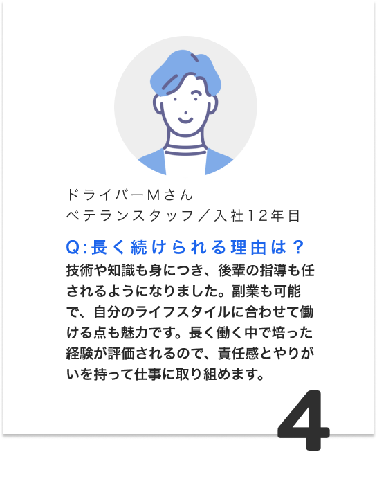 副業も可能で服装や髪型も自由です。勤務時間は決まっていますが、家庭や趣味とも両立しやすく、無理なく長く続けられる環境です。