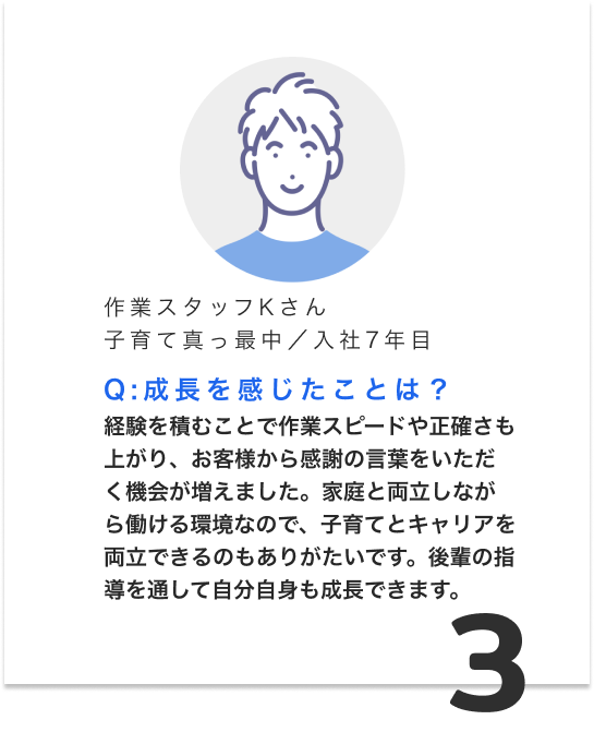 業務は効率よく進められ、残業はほとんどありません。プライベートの予定も立てやすく、家庭や趣味の時間を大切にしながら働けます。